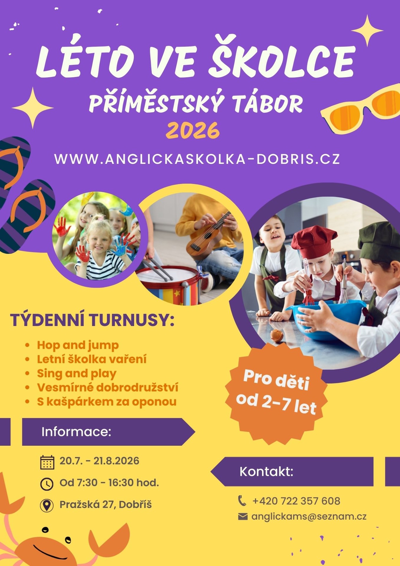 3. turnus (3.8. - 7.8.) - "SING AND PLAY - ANGLIČINA HROU" Tento anglický týden "SING AND PLAY" bude plný zábavy, her, hudby, pohybu a smíchu. Angličtina bude vyučována pomocí hry. Lektor mluví během hry s dětmi anglicky, zároveň dle potřeby plynule přechází do jazyka českého, popř. překládá či doplňuje hru českým komentářem. S anglickým jazykem bude lektor pracovat v rámci denního programu. Bude ho propojovat s různými vzdělávacími i režimovými činnostmi, s aktivní zábavou i hrou. Kromě vlastní koncepce výuky využíváme širokou škálu speciálních pomůcek - obrázkové karty, stolní hry, puzzle, CD a DVD s písničkami a krátkými příběhy pro děti v anglickém jazyce.